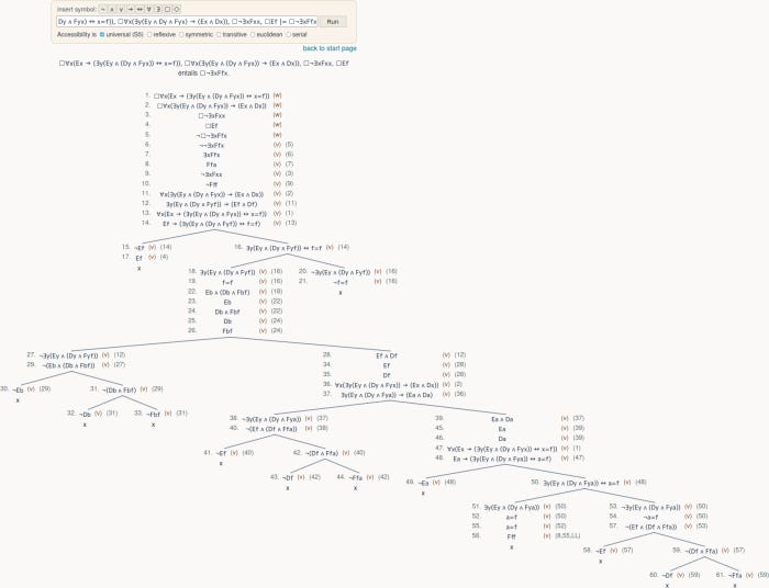 □∀x(Ex → (∃y(Ey ∧ Dy ∧ Fyx) ↔ x=f)), □∀x(∃y(Ey ∧ Dy ∧ Fyx) → (Ex ∧ Dx)), □¬∃xFxx, □Ef |= □¬∃xFfx