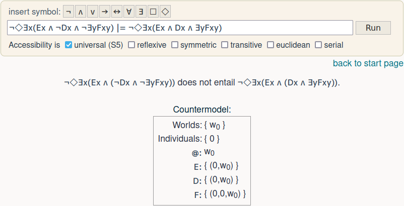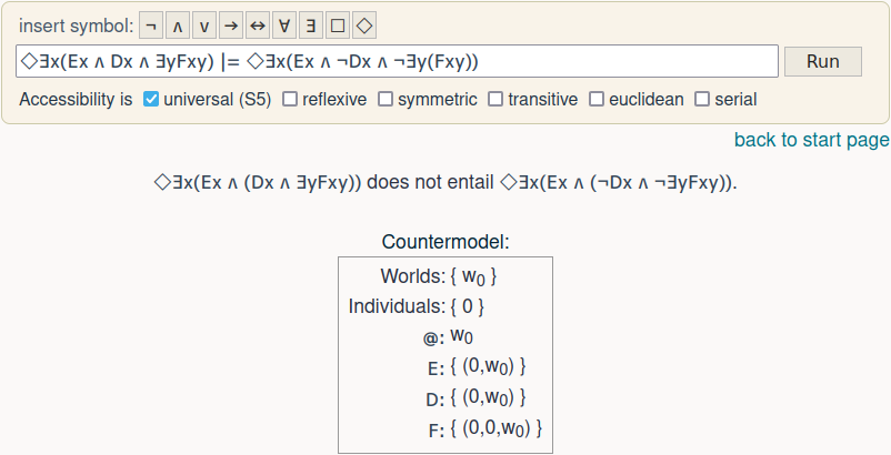 ◇∃x(Ex ∧ Dx ∧ ∃yFxy) |= ◇∃x(Ex ∧ ¬Dx ∧ ¬∃y(Fxy))
